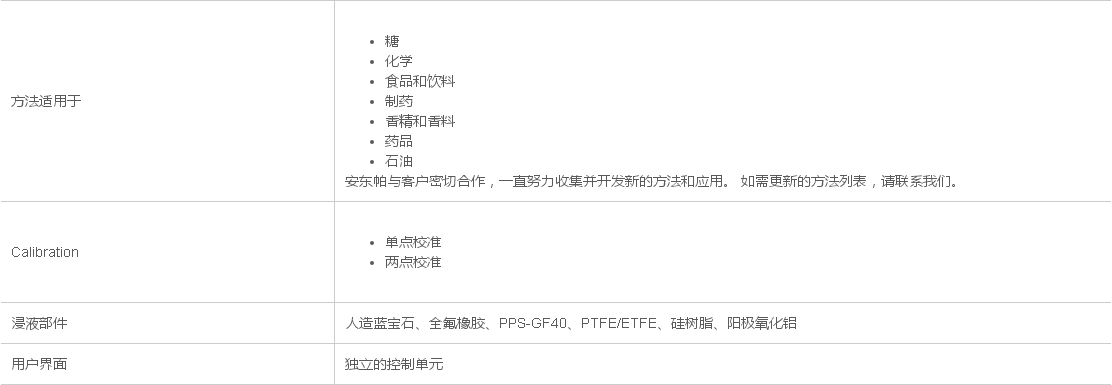 Abbemat 高端多功能系列由高端儀器組成,用于測(cè)量二元溶液的濃度。安東帕提供最簡(jiǎn)單的質(zhì)量控制。提供從酸濃度到 Zeiss 的 200 多種方法可確保獲得常見物質(zhì)的濃度。