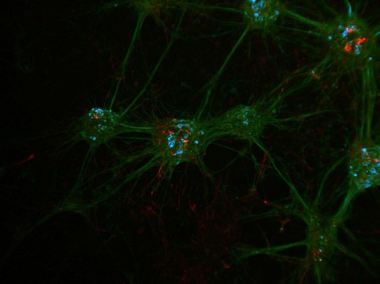 Neuronal cell culture stained with DAPI, beta III Tubulin–Cy2, Nestin-Cy3 (LMS Bioanalytik GmbH, Magdeburg, Germany). Blue indicates the nuclei of the cells, green neurons expressing beta III Tubulin, and red stem cells expressing Nestin. Image was acquired with a M205 FCA stereo microscope, LMT260 x/y stage, DFC3000 G microscope camera and Fluocombi III at 400x.