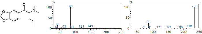 隸屬于卡西酮類的鹽酸鹽標(biāo)準(zhǔn)品(3,4-亞甲基雙氧苯基甲胺戊酮)的EI質(zhì)譜圖(左)與CI質(zhì)譜圖(右)