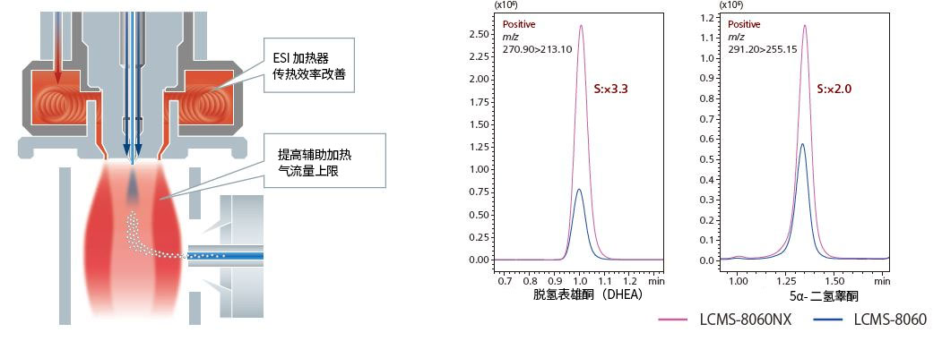 LCMS-8060NX 通過提高加熱器的傳熱效率和提高輔助加熱氣流量上限,提升脫溶劑效率。因此,對于類固醇激素等難以電離化合物的檢測靈敏度可以進(jìn)一步提升。以下的分析實(shí)例說明了通過改善脫溶劑效率可以提高類固醇激素分析靈敏度。
