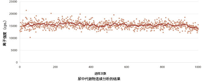 以下數(shù)據(jù)是將僅用水稀釋過的尿液作為樣品,對尿中代謝物進(jìn)行連續(xù)分析的結(jié)果。使用 LCMS-8060NX,即使在對復(fù)雜基質(zhì)樣品進(jìn)行連續(xù)測定時(shí)靈敏度也不會(huì)降低,獲得穩(wěn)定的分析結(jié)果。